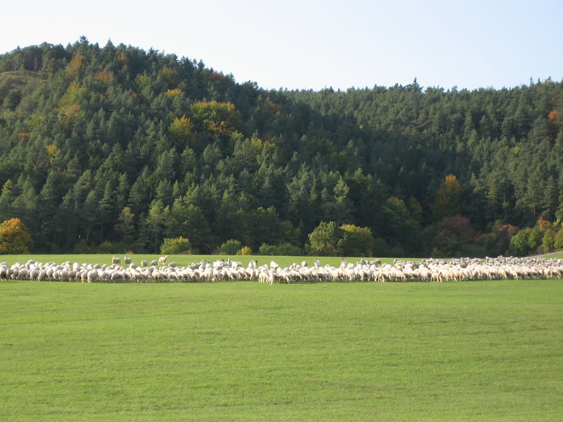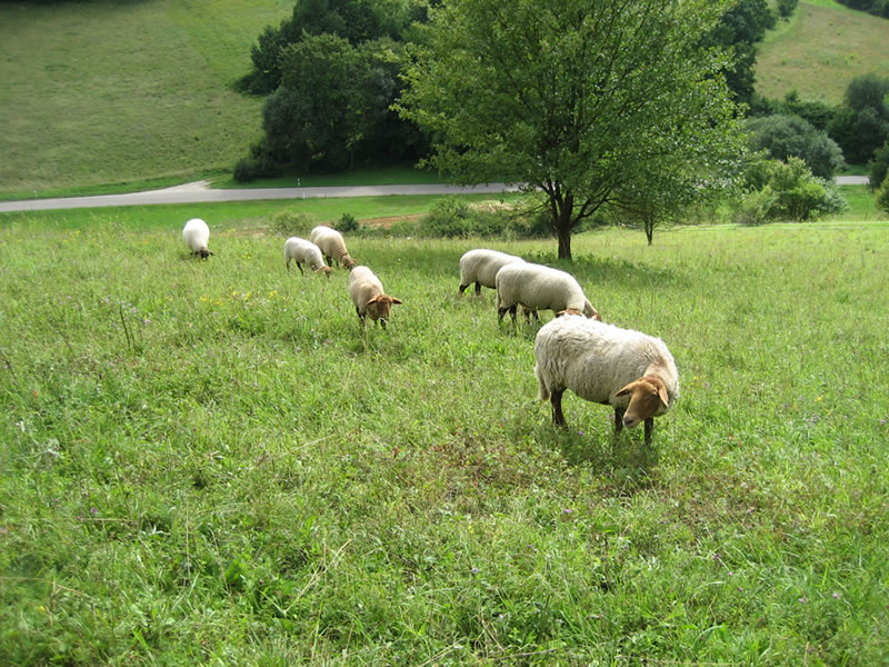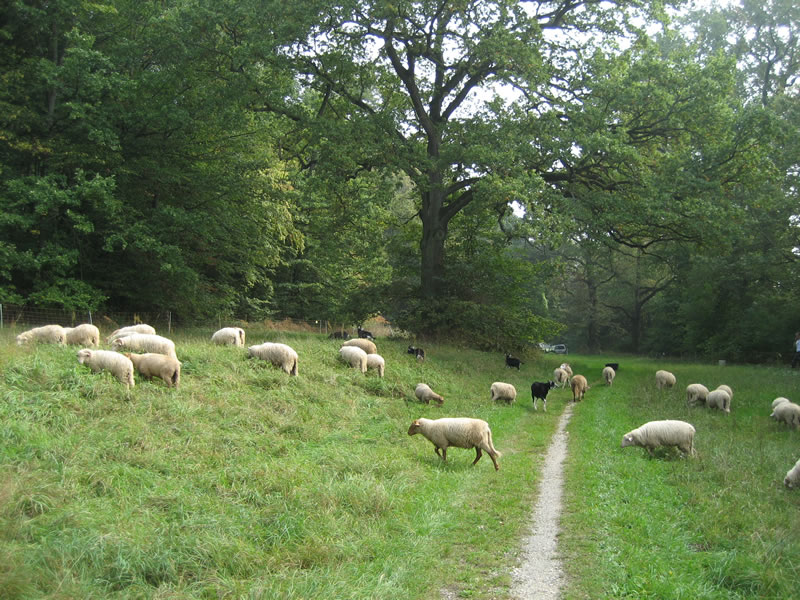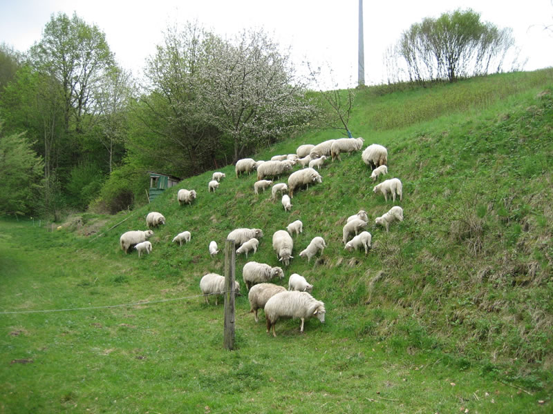 Umtriebsweide: Die Schafe beweiden nacheinander durch Zäune unterteilte Flächen. Die Größe der Koppeln errechnet sich nach der angestrebten Beweidungszeit je Fläche und der Zeit bis zum Erreichen der Beweidungsreife der nächsten Koppel. Am Ende der Weideperiode können dann mehrere Flächen zusammengefasst werden. Nach oben.
